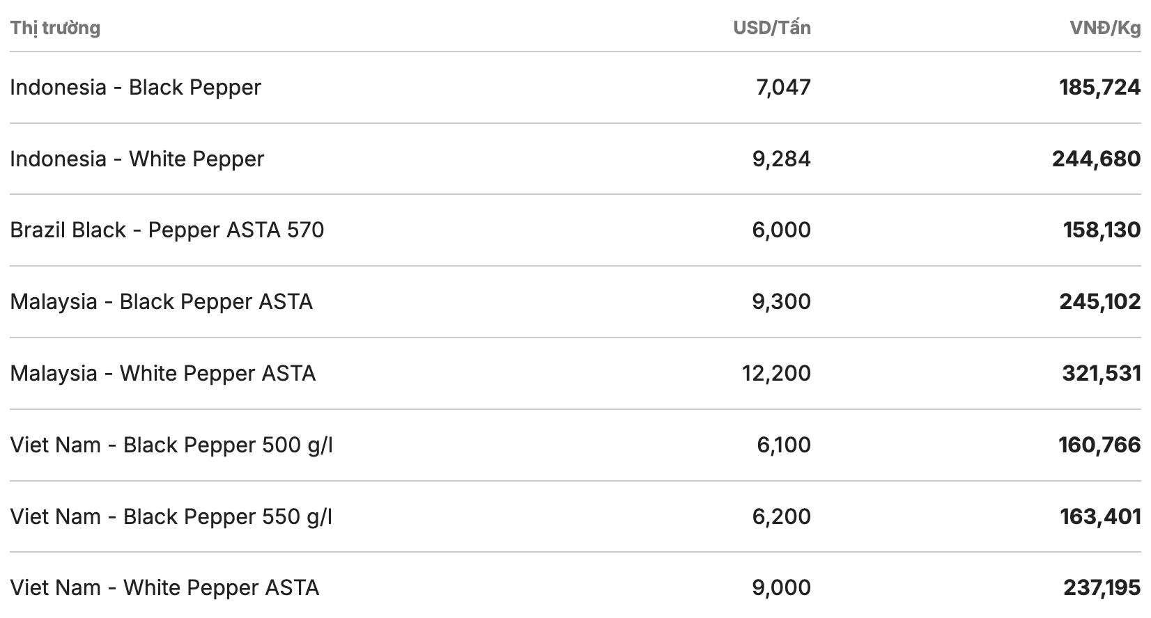 In the world market, pepper prices in Indonesia turned down. Meanwhile, prices in other key producing countries still maintain a stable trend, showing that current fluctuations are more localized than a widespread downward trend.