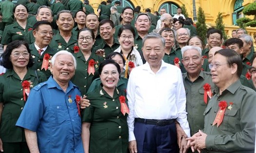 On the occasion of the 77th anniversary of War Invalids and Martyrs' Day (July 27, 1947 - July 27, 2024), on the afternoon of July 22, at the Presidential Palace, President To Lam met in an intimate meeting with a delegation of people with meritorious services to the revolution, representing the whole world. country in 2024.