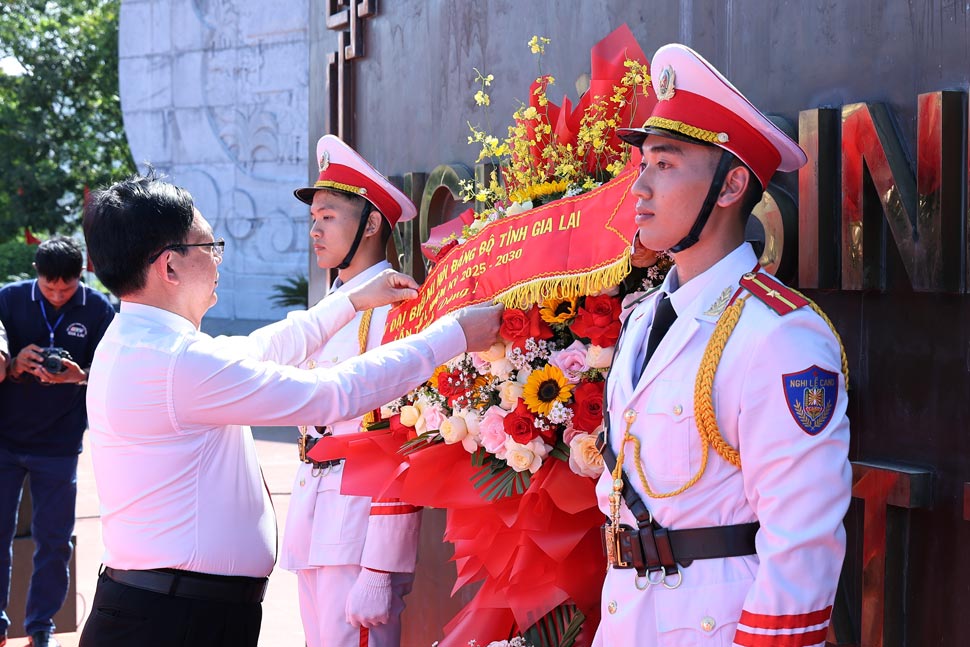 Before the banquet session, delegates offered flowers at the Nguyen Sinh Sac - Nguyen Tat Thanh Monument (Quy Nhon Ward).
