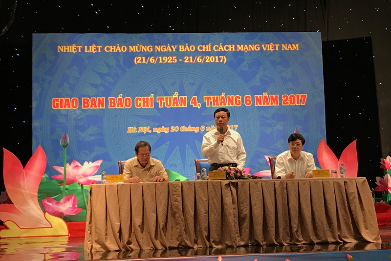 | Lãnh đạo Bộ TT&TT, Ban Tuyên giáo TƯ và Hội nhà báo tại cuộc giao ban báo chí ngày 20.6. Ảnh: PV |