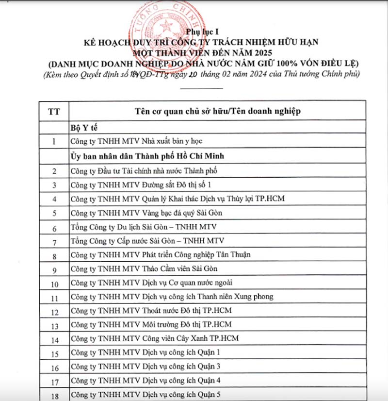 Quyết định nêu rõ phê duyệt kế hoạch sắp xếp lại doanh nghiệp nhà nước, doanh nghiệp có vốn nhà nước trực thuộc Bộ Y tế, UBND TP Hồ Chí Minh và UBND tỉnh Hải Dương đến hết năm 2025 theo các hình thức: Duy trì công ty trách nhiệm hữu hạn một thành viên; cổ phần hóa, sáp nhập; chuyển nhượng một phần hoặc toàn bộ vốn nhà nước (thoái vốn), gồm các phụ lục sau: