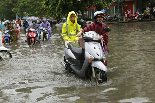 Sáng sớm 13.6, tại Thủ đô Hà Nội xuất hiện cơn mưa lớn trên diện rộng. Nhiều tuyến đường trở nên ngập úng, giao thông tê liệt. Có thời điểm, lực lượng cảnh sát giao thông đã phải ngâm mình trong nước mưa điều tiết giao thông.