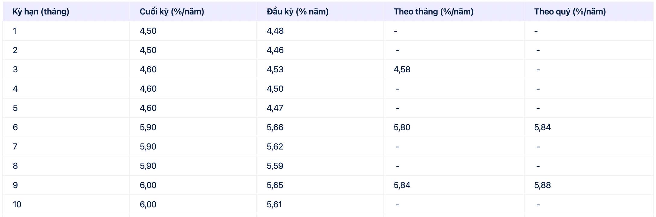 Cake by VPBank is listing the highest interest rate for 12-month terms at 6.1%/year when customers receive interest at the end of the term. Customers receiving interest at the beginning of the term, monthly and quarterly, receive interest rates of: 5.64%; 5.88%; 5.92%, respectively.