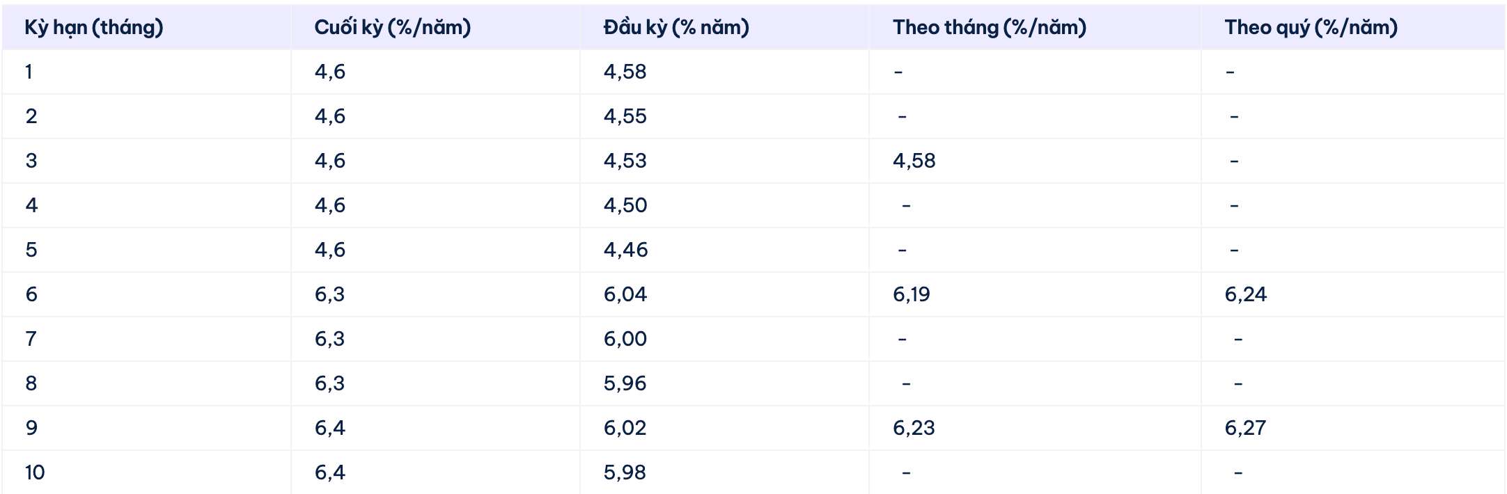 BacABank is listing the highest interest rate for 12-month deposits at 6% when individual customers deposit money online and receive interest at the end of the term. Currently, BacABank is listing the highest interest rate at 6.3%/year for a term of 18-36 months.