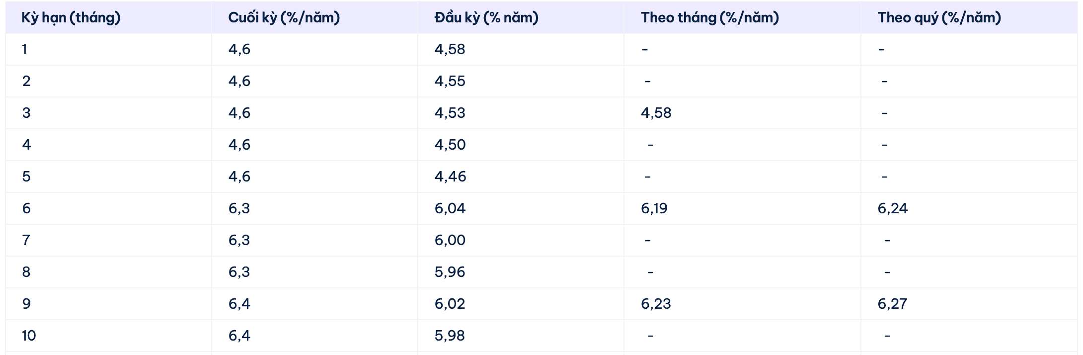 BacABank is listing the highest interest rate for 12-month deposits at 6% when individual customers deposit money online and receive interest at the end of the term. Currently, BacABank is listing the highest interest rate at 6.3%/year for a term of 18-36 months.