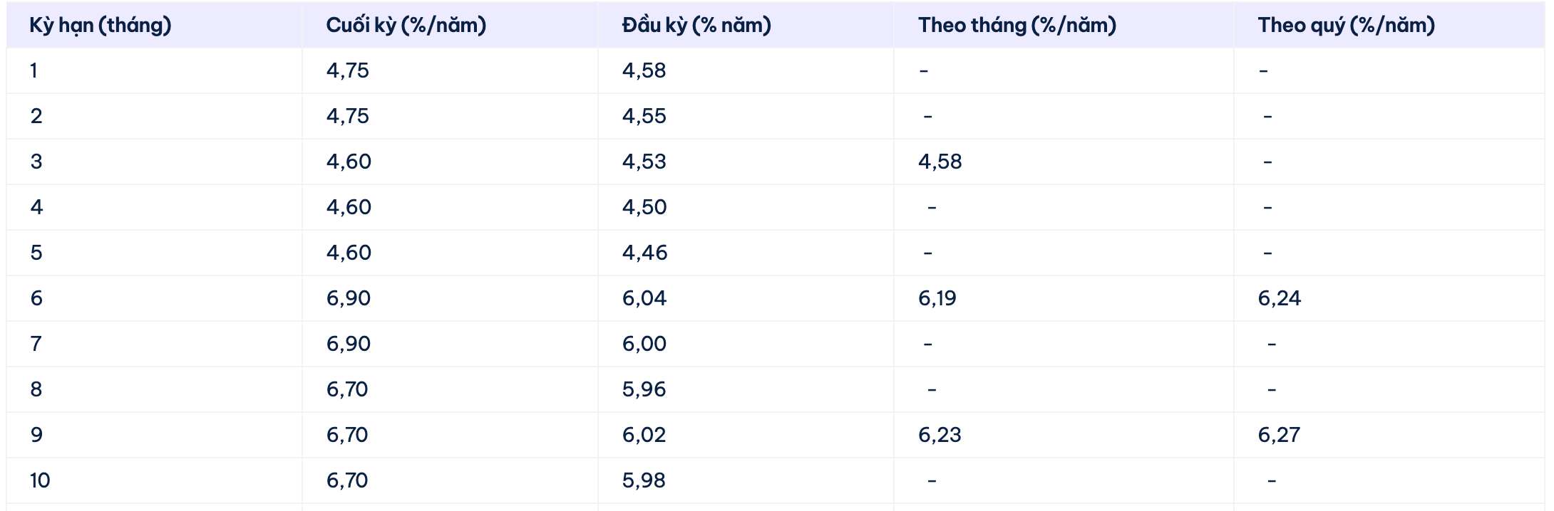 First, Cake by VPBank is listing the highest interest rate for 6-month deposits at 6.9%/year when customers receive interest at the end of the term. When customers receive interest at the beginning of the term, monthly and quarterly, they will receive interest rates of 6.04% and 6.19% and 6.24%/year, respectively.