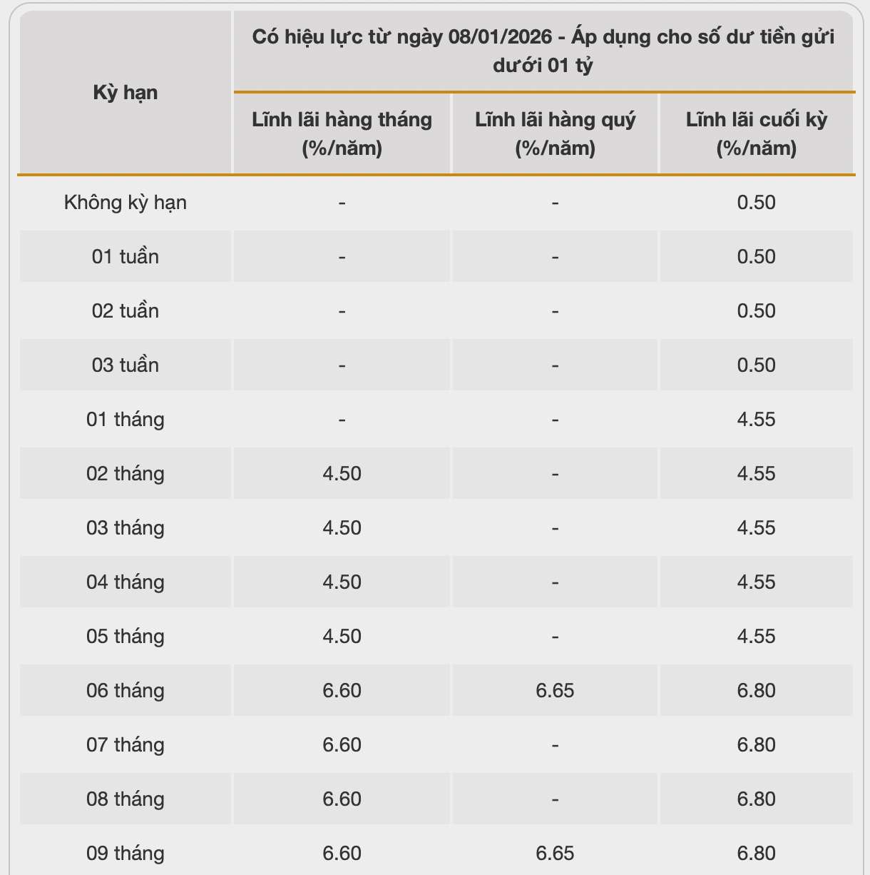 According to a survey at 3:00 PM on January 18, 2026 with nearly 30 banks, Cake by VPBank is listing the highest interest rate for a 6-month term at 7.3%/year when customers receive interest at the end of the term. When customers receive interest at the beginning of the term, monthly and quarterly, they will receive interest rates of 6.04%, 6.19% and 6.24%/year respectively.