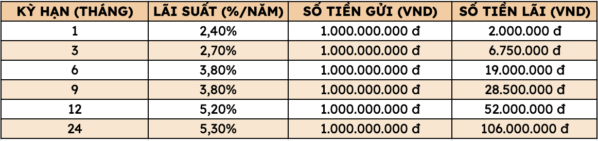 Thus, depositing 1 billion VND at Agribank, customers can receive the highest interest rate as follows (applied to individual customers depositing directly at the counter):