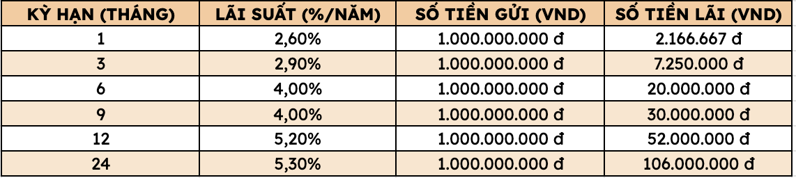 Thus, depositing 1 billion VND at Agribank, customers can receive the highest interest rate as follows (applied to individual customers depositing directly at the counter):