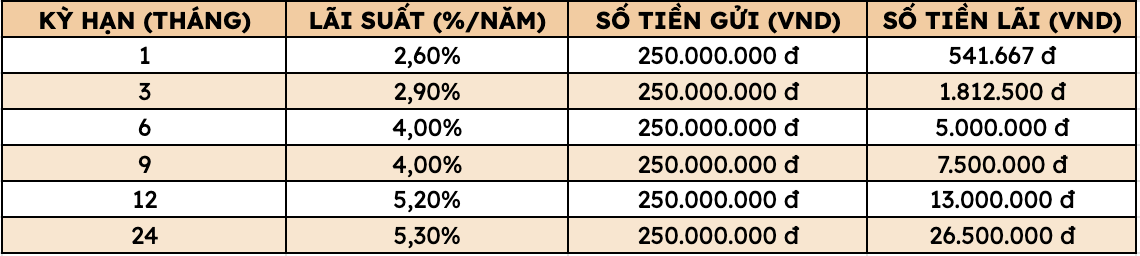 Thus, depositing 250 million VND at Agribank, customers can receive the highest interest rate as follows (applied to individual customers depositing directly at the counter):