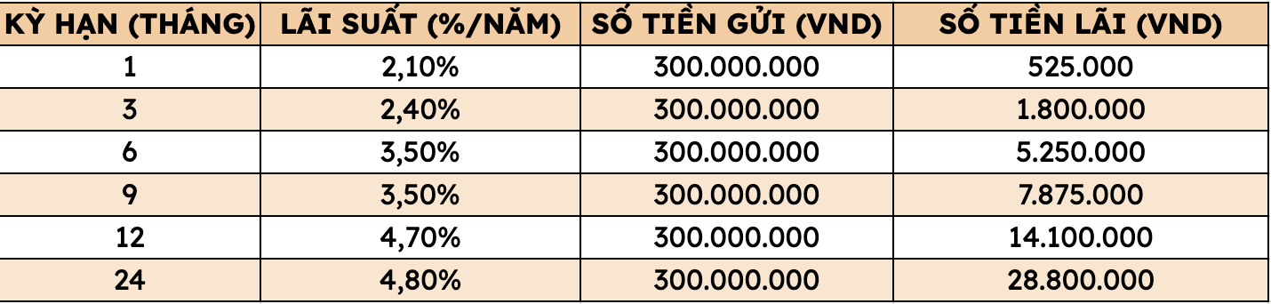 Thus, depositing 300 million VND at Agribank, customers can receive the highest interest rate as follows (applicable to individual customers depositing directly at the counter):