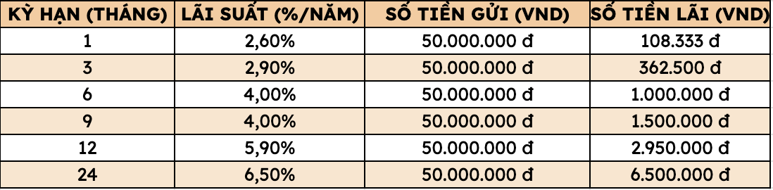 Thus, depositing 50 million VND at Agribank, customers can receive the highest interest rate as follows (applied to individual customers depositing directly at the counter):
