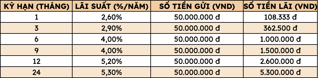 Thus, depositing 50 million VND at Agribank, customers can receive the highest interest rate as follows (applied to individual customers depositing directly at the counter):
