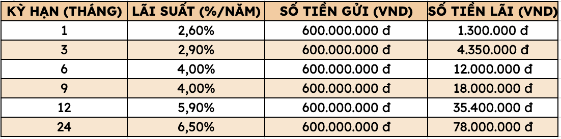 Thus, depositing 600 million VND at Agribank, customers can receive the highest interest rate as follows (applied to individual customers depositing directly at the counter):