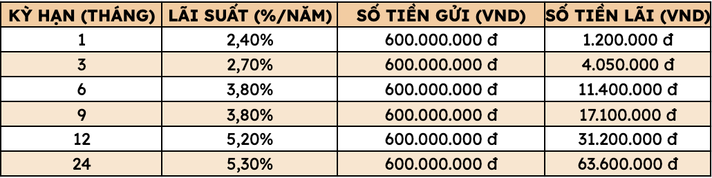 Thus, depositing 600 million VND at Agribank, customers can receive the highest interest rate as follows (applied to individual customers depositing directly at the counter):