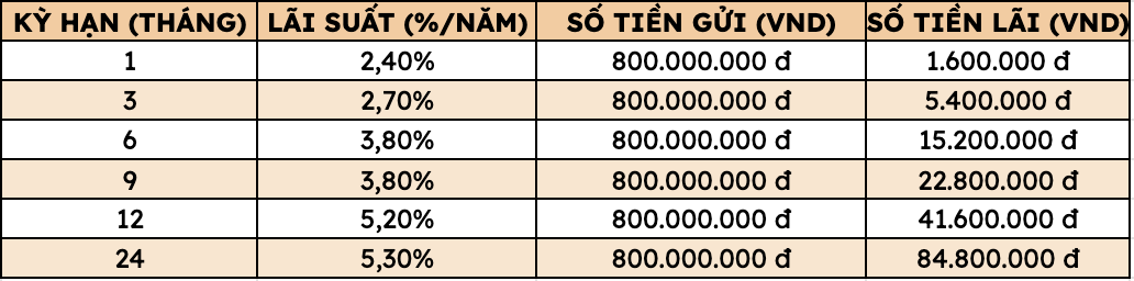 Thus, depositing 800 million VND at Agribank, customers can receive the highest interest rate as follows (applied to individual customers depositing directly at the counter):