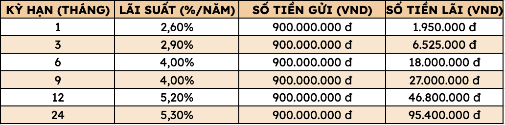 Thus, depositing 900 million VND at Agribank, customers can receive the highest interest rate as follows (applied to individual customers depositing directly at the counter):