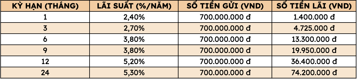 Depositing 700 million VND at Agribank, how much interest will you receive at each term?