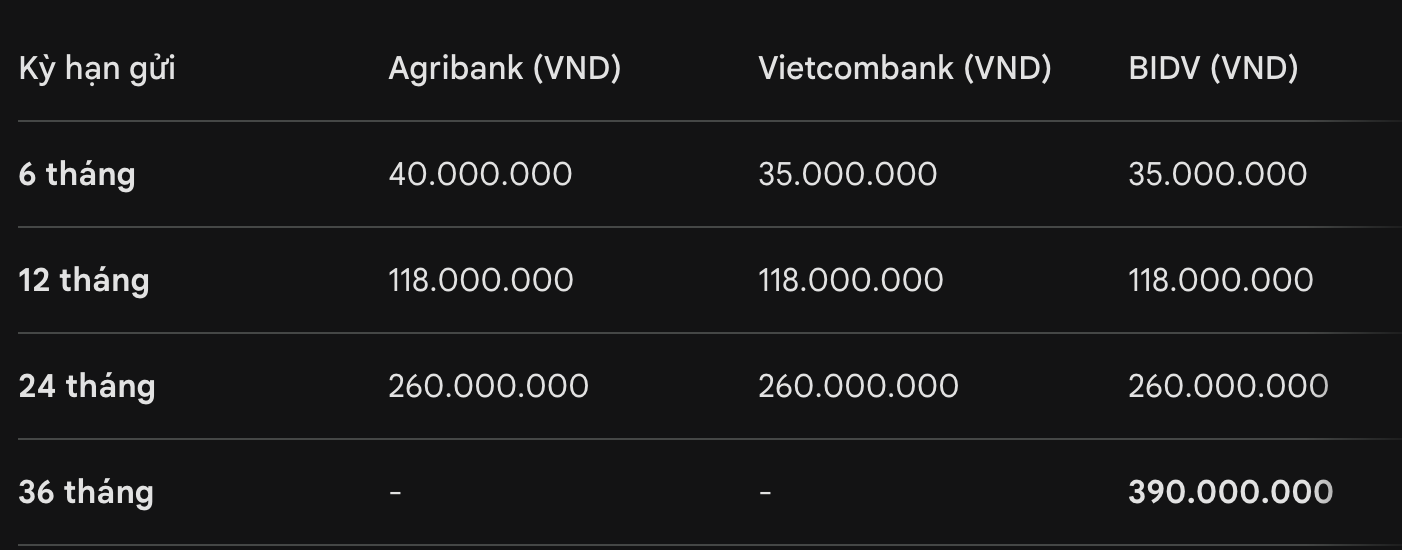 For the 24-month term, all 3 banks paid the same end-of-term interest of 260 million VND.