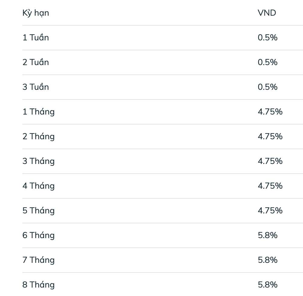 According to a survey by Lao Dong on April 5, 2026, BIDV lists interest rates for 1-3 weeks at 0.5%/year. Savings interest rates for individual customers with terms of 1-5 months are 4.75%/year. Savings interest rates at BIDV for terms from 6-11 months are 5.8%/year. Customers depositing money for 12-18 months receive an interest rate of 5.9%/year. Customers depositing money for 24-36 months receive an interest rate of 6.5%/year.