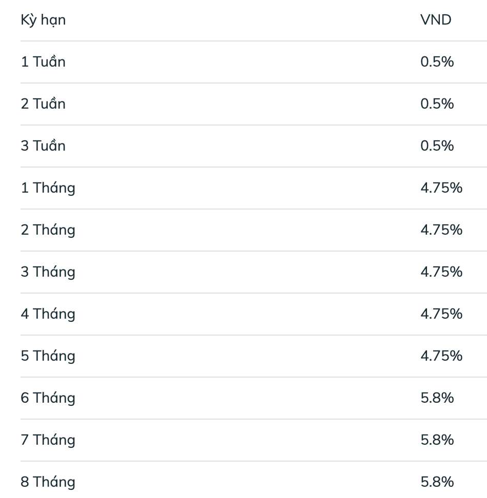 According to a survey by Lao Dong on April 2, 2026, BIDV lists interest rates for 1-3 weeks at 0.5%/year. Savings interest rates for individual customers with terms of 1-5 months are 4.75%/year. Savings interest rates at BIDV for terms from 6-11 months are 5.8%/year. Customers depositing money for 12-18 months receive an interest rate of 5.9%/year. Customers depositing money for 24-36 months receive an interest rate of 6.5%/year.