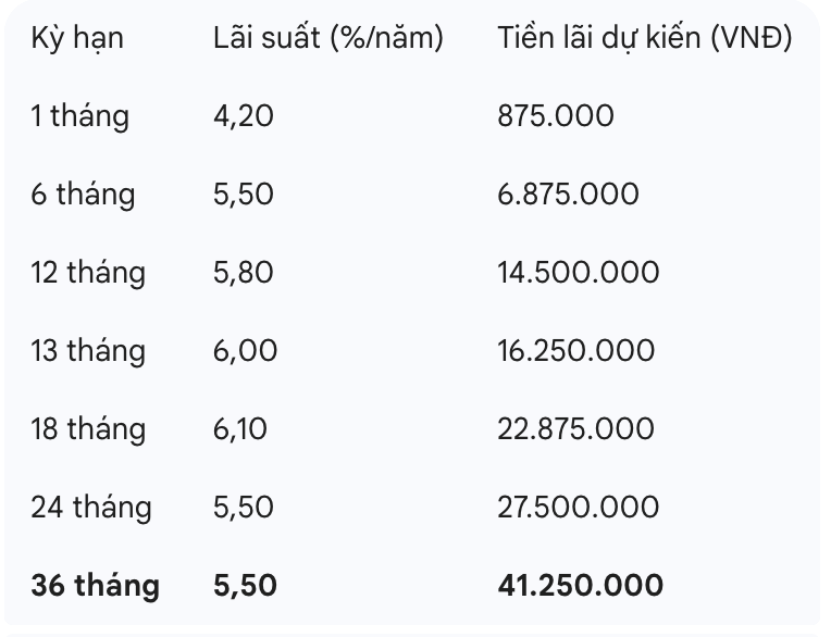 However, if there is no need to use capital for a long time, the 36-month term will bring the highest total actual interest received, up to 41,250,000 VND, helping to maximize profits for idle money.