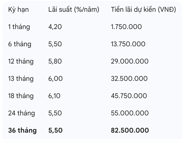 However, if there is no need to use capital for a long time, the 36-month term will bring the highest total actual interest received, up to 82.5 million VND, helping to maximize profits for idle money.