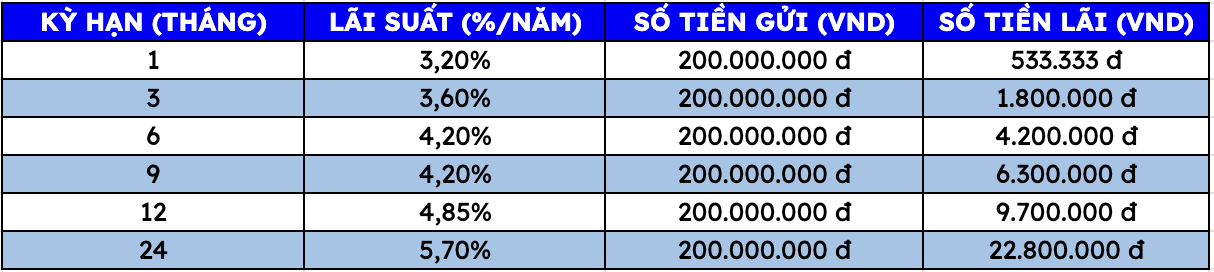 Thus, depositing 200 million VND at MBBank, customers can receive the highest interest rate as follows (applicable to individual customers paying the following interest):