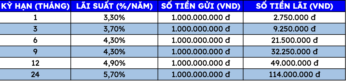 Thus, depositing 1 billion VND at MBBank, customers can receive the highest interest rate as follows (applicable to individual customers paying the following interest):