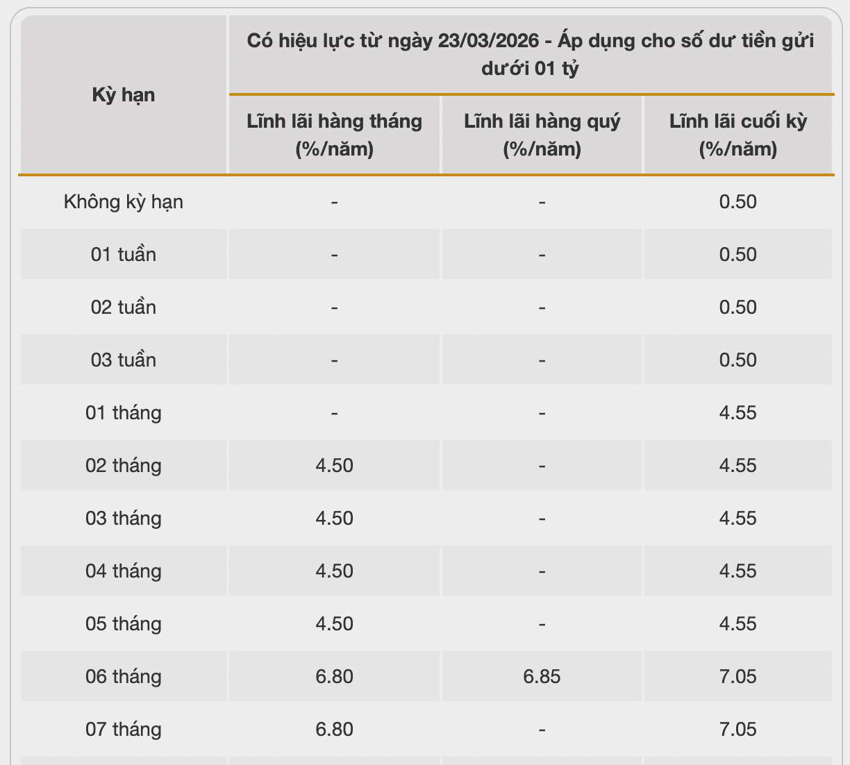 Following suit, HDBank with an interest rate of 7.7% for a 12-month term, conditions for maintaining a minimum balance of 500 billion VND. Under normal conditions, HDBank lists the highest 12-month interest rate at 5.8% when customers deposit money online and 5.7% when depositing money at the counter.
