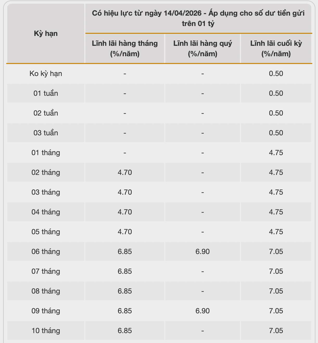 Cake by VPBank is offering an additional interest rate of 1.3%/year for individual customers who use the deposit product for the first time and meet the following conditions: Method of receiving interest: End of term, beginning of term, monthly, quarterly; Deposit term: From 6 months or more and no pre-term settlement. Application period until April 30, 2026.
