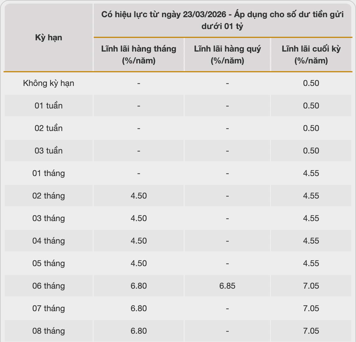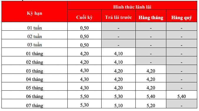 Following suit, HDBank with an interest rate of 7.7% for a 12-month term, conditions for maintaining a minimum balance of 500 billion VND. Under normal conditions, HDBank lists the highest 12-month interest rate at 5.8% when customers deposit money online and 5.7% when depositing money at the counter.