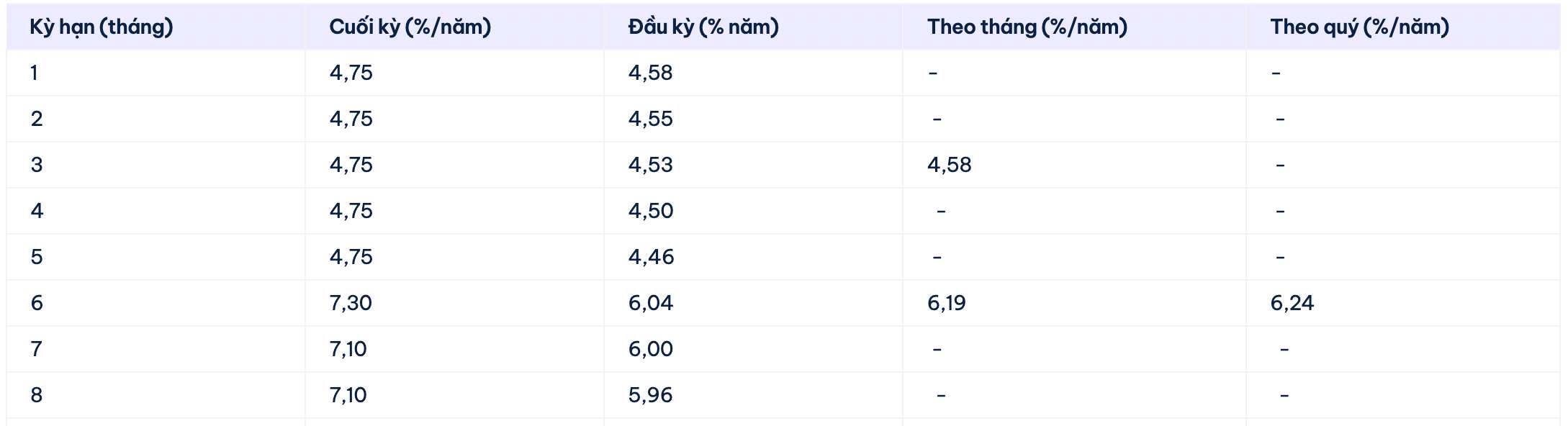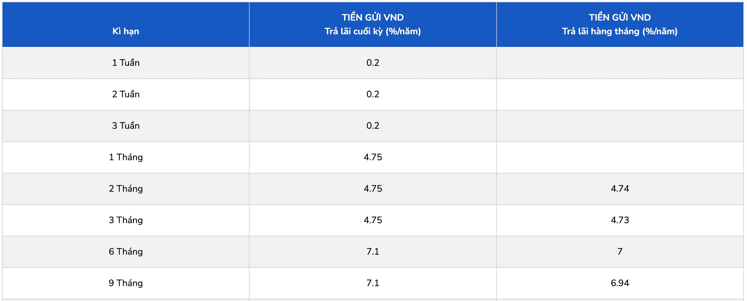Cake by VPBank is listing the highest interest rate for a 13-month term at 7.1%/year when customers receive interest at the end of the term. Currently, the highest interest rate listed by Cake by VPBank is 7.3% applied for a 13-month term.