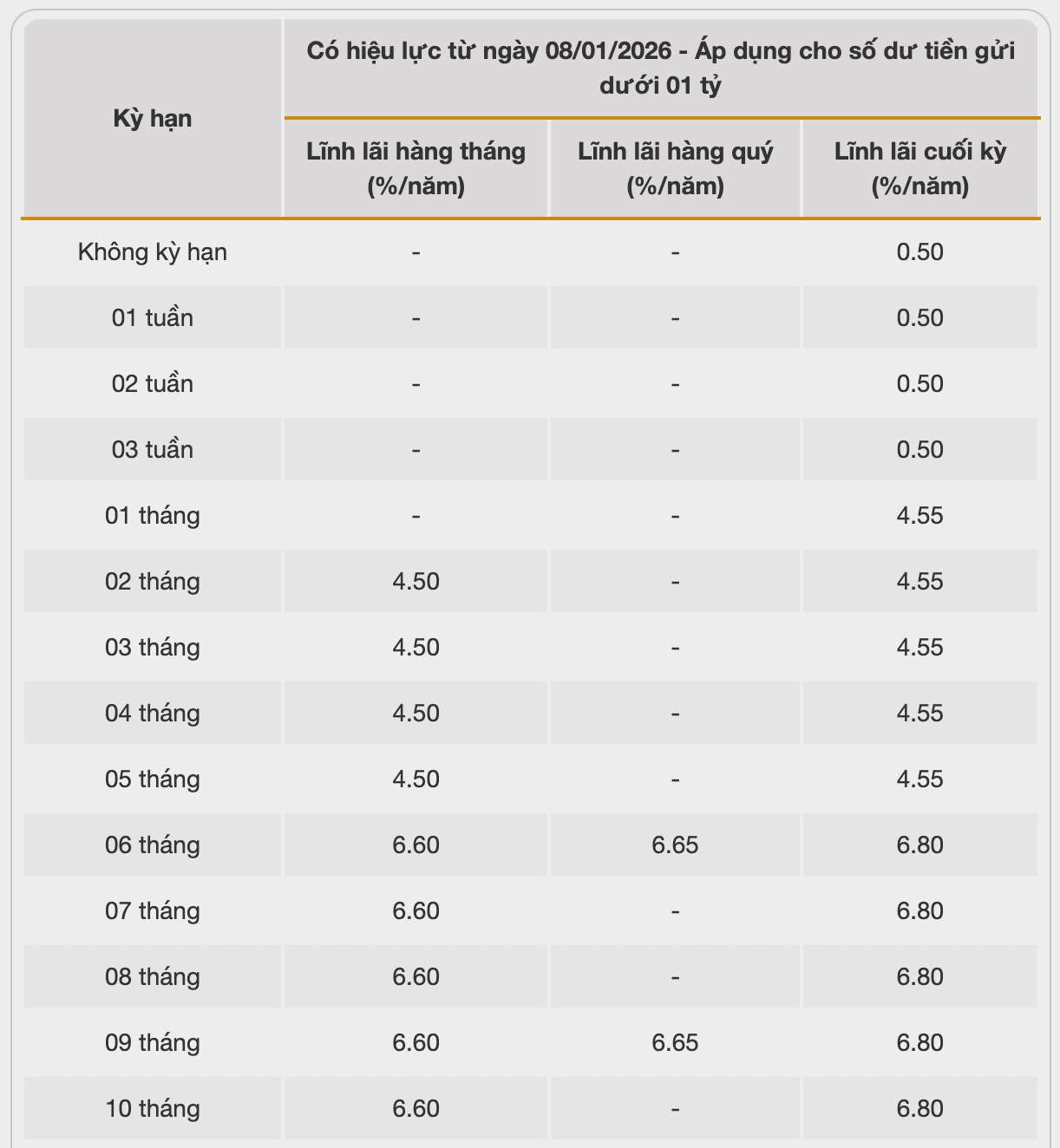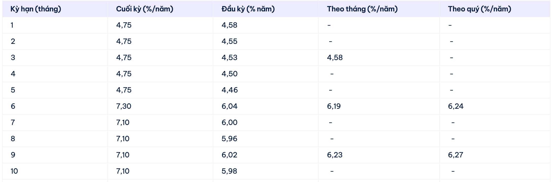 Bac A Bank is listing the highest interest rate for a 13-month term at 6.85% when individual customers deposit money online, receiving interest at the end of the term. Currently, Bac A Bank is listing the highest interest rate at 6.9%/year for terms from 18-36 months.