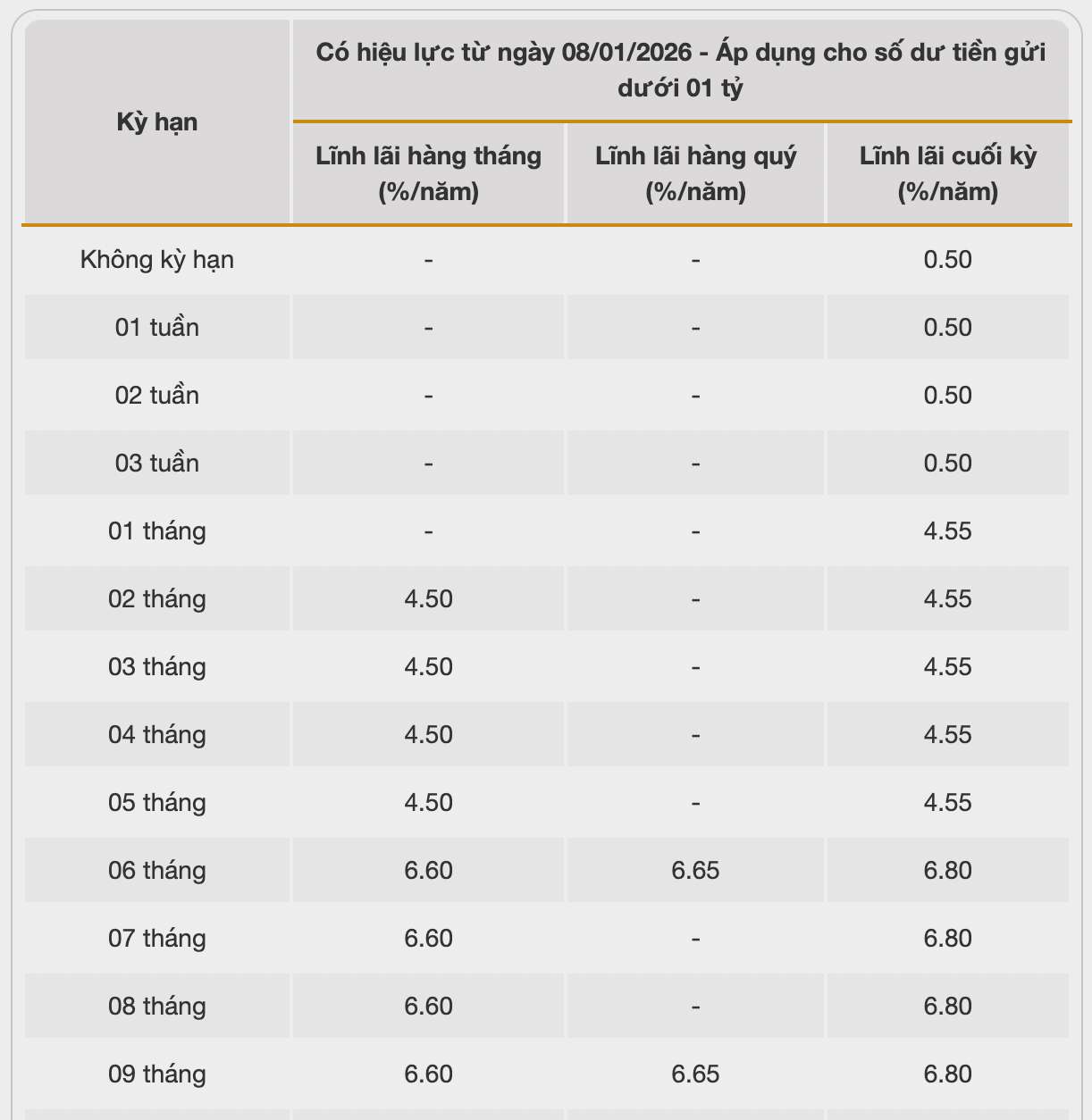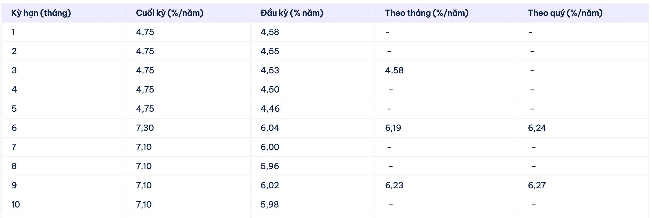 Vikki Bank is listing the highest interest rate for a 6-month term at 6.5%/year when customers deposit money online and receive interest at the end of the term. The highest term this unit is listing the highest interest rate is 13 months, at 6.7%.