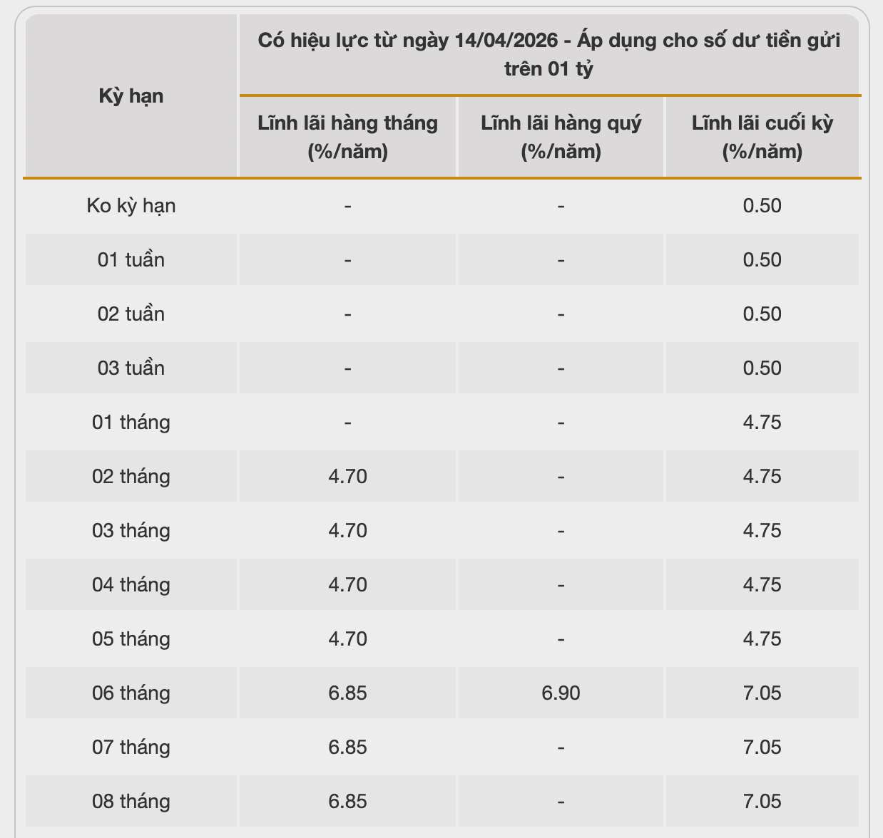 Currently, Cake by VPBank is adding interest directly to the listed interest rate in a tiered manner for customers who open new term deposit accounts at Cake by VPBank Digital Bank through the CAKE BANK application. The additional interest rate is as follows: From 5 million VND, it will be increased by 1%/year; from 100 million VND, it will be increased by 1.3%/year. The application period is from April 16, 2026 to the end of May 31, 2026.