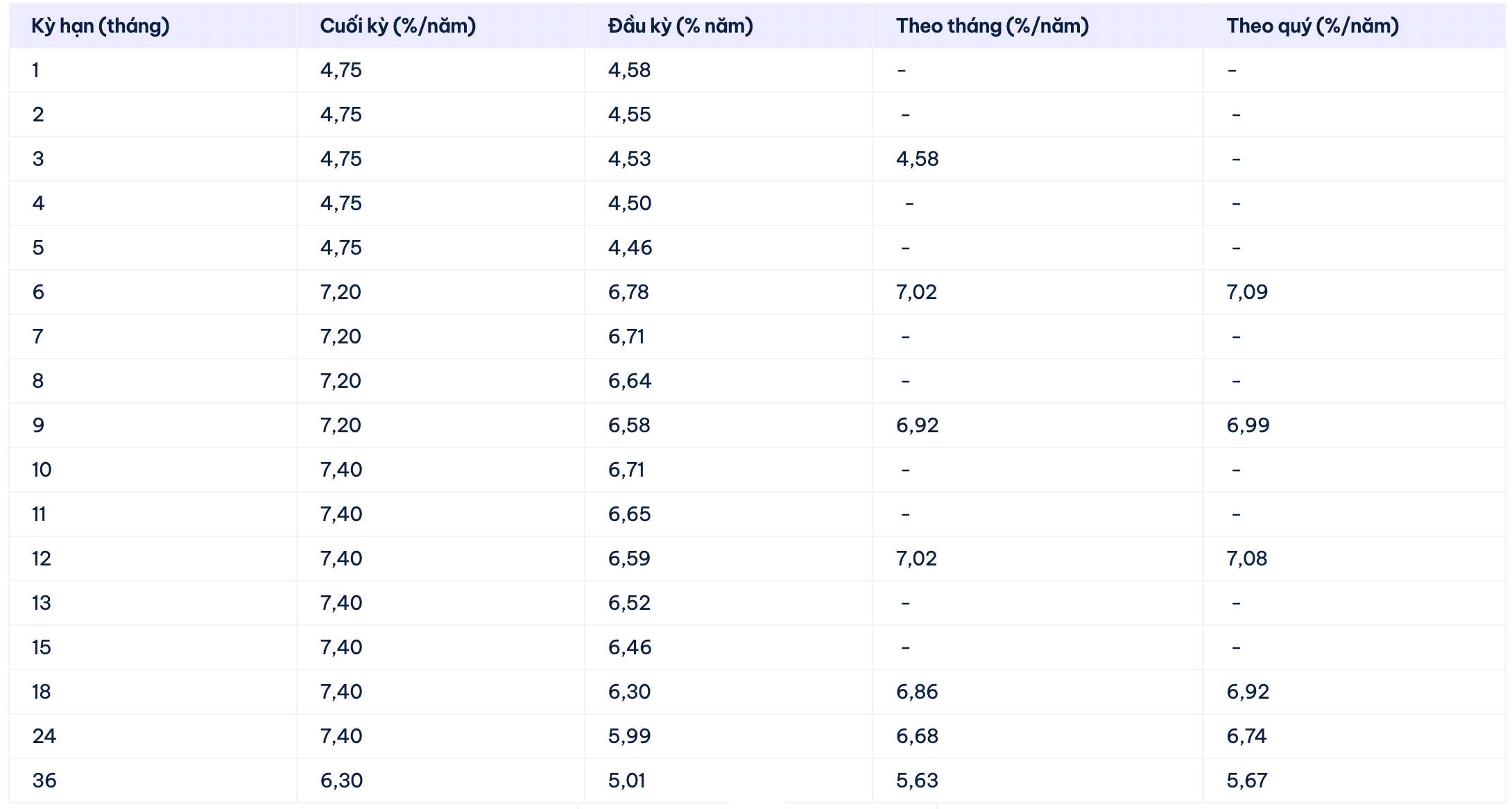 According to a survey with nearly 30 banks, Cake by VPBank is listing 6-month term interest rates at a normal rate of 7.2%/year when customers receive interest at the end of the term. When customers receive interest at the beginning of the term, monthly and quarterly, they will receive interest rates of 6.78%, 7.02% and 6.79%/year respectively.