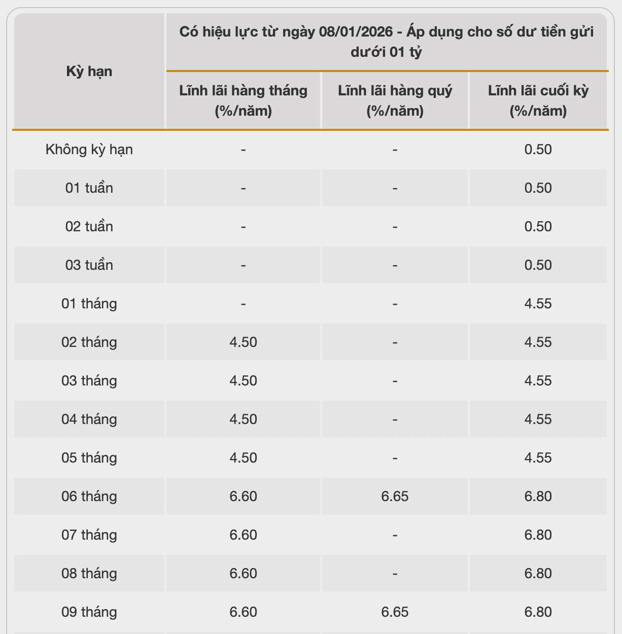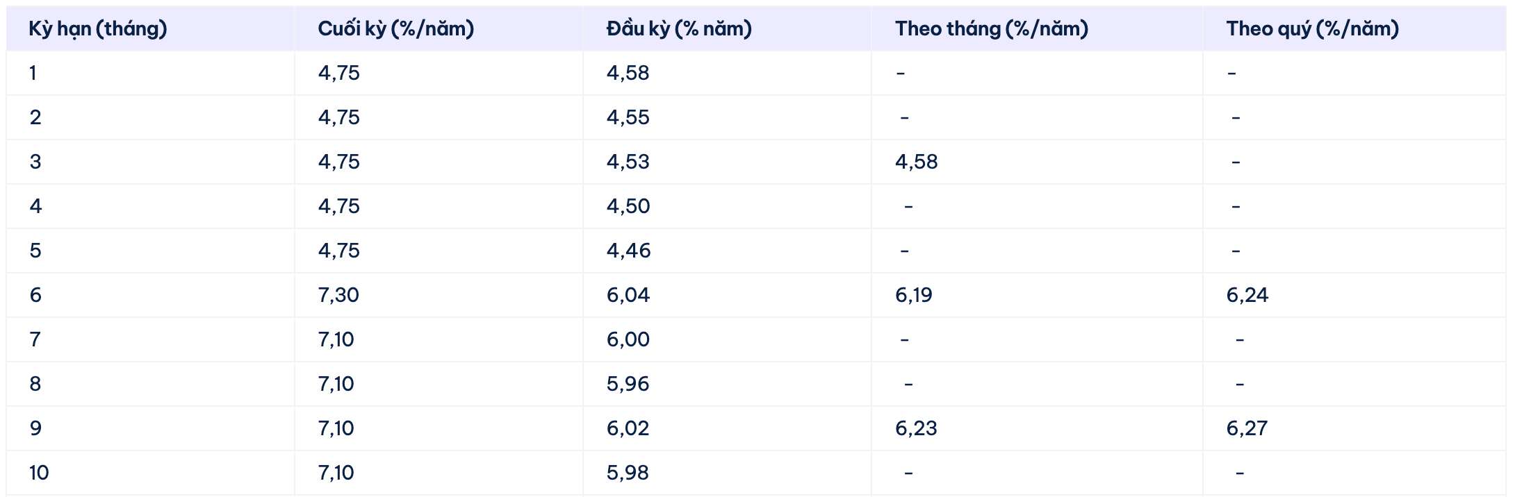 Bac A Bank is listing the highest interest rate for a 13-month term at 6.85% when individual customers deposit money online and receive interest at the end of the term. Currently, Bac A Bank is listing the highest interest rate at 6.9%/year for terms from 18-36 months.