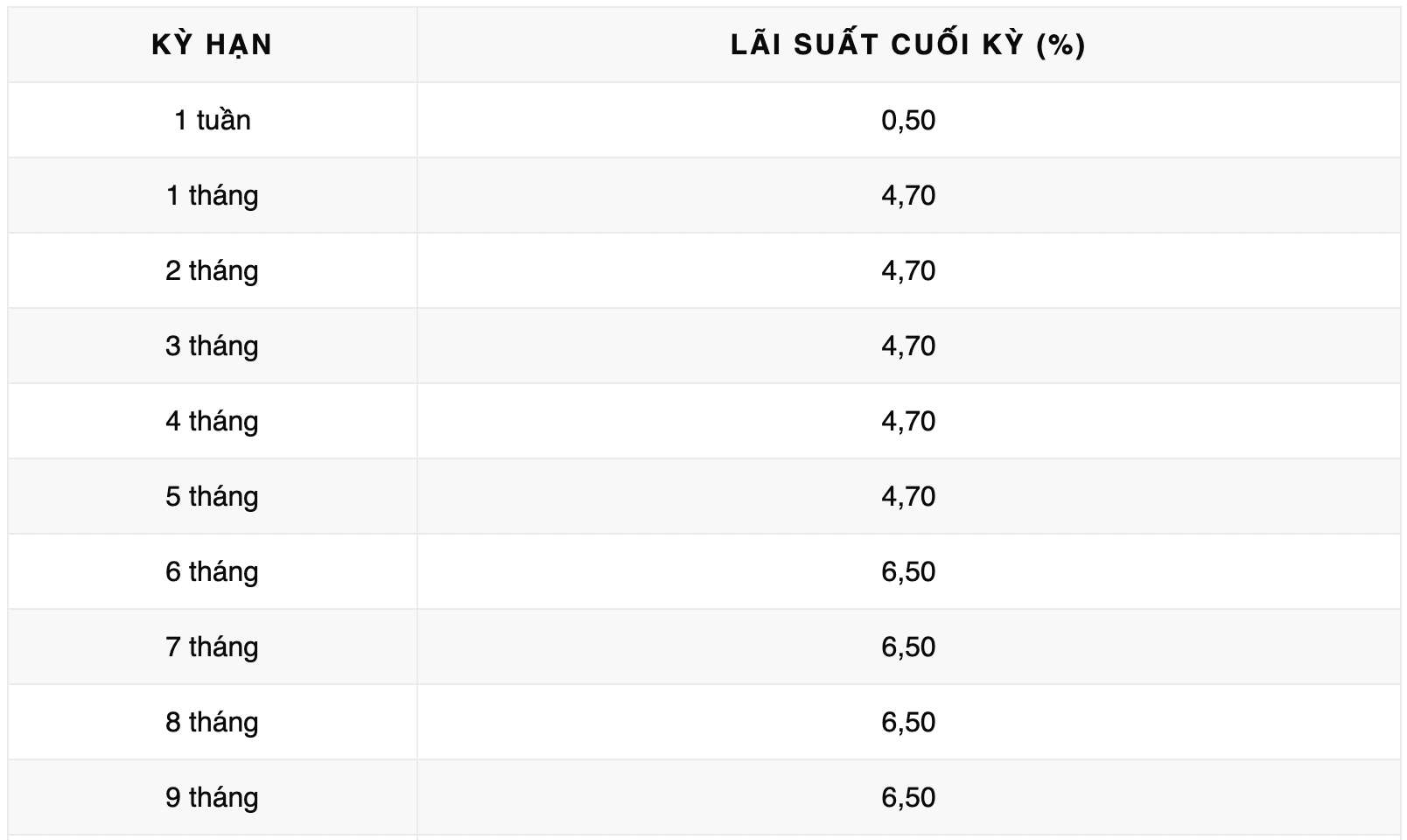 Vikki Bank lists the highest interest rate for a 6-month term at 6.5%/year when customers deposit money online and receive interest at the end of the term. Vikki Bank lists the highest interest rate at 6.7% when customers deposit money for a 13-month term.