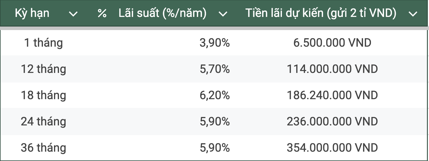 When depositing 2 billion VND, calculating the total profit at the end of the term is very important. Although the highest Vikki Bank interest rate is 6.20%/year applied to an 18-month term (about 186.24 million VND), customers aiming for the highest absolute profit target should choose a longer term.