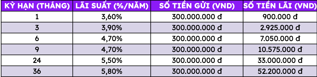 Depositing 300 million VND at TPBank, how much interest will you receive at each term?
