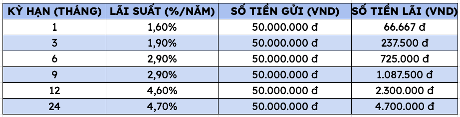 Thus, depositing 50 million VND at Vietcombank, customers can receive the highest interest rate as follows (applicable to individual customers depositing directly at the counter):