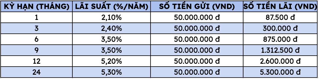 Thus, depositing 50 million VND at Vietcombank, customers can receive the highest interest rate as follows (applicable to individual customers depositing directly at the counter):