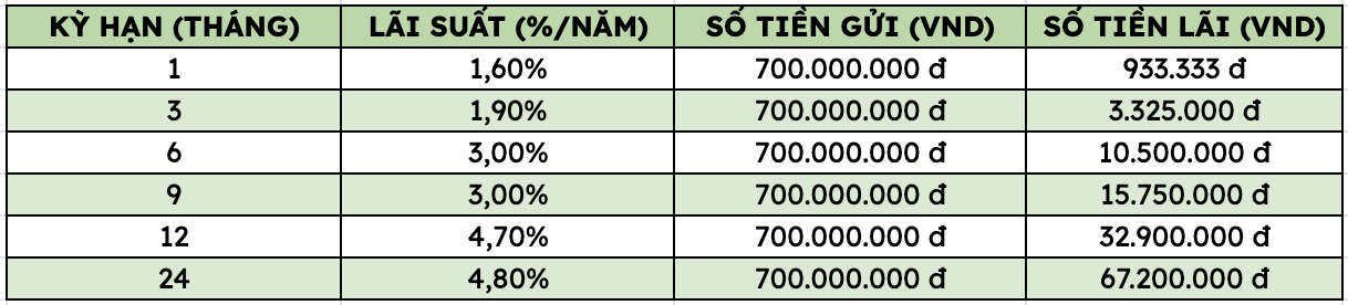 Depositing 700 million VND at VietinBank, how much interest will you receive at each term?