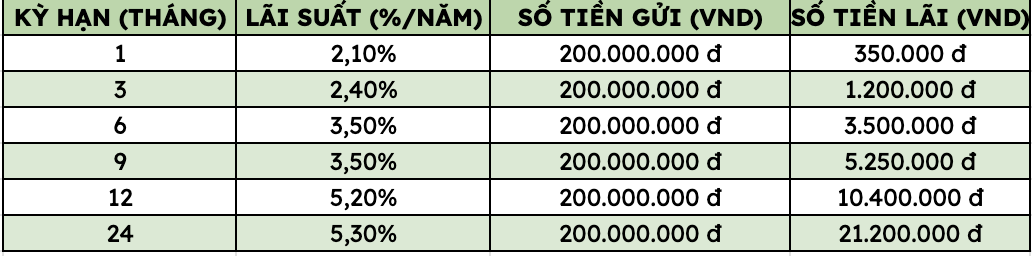 Thus, depositing 200 million VND at VietinBank, customers can receive the highest interest rate as follows (applied to individual customers depositing directly at the counter):