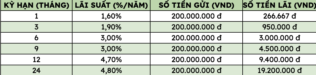Thus, depositing 200 million VND at VietinBank, customers can receive the highest interest rate as follows (applicable to individual customers depositing directly at the counter):