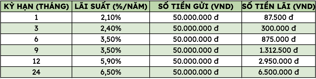 Thus, depositing 50 million VND at VietinBank, customers can receive the highest interest rate as follows (applied to individual customers depositing directly at the counter):