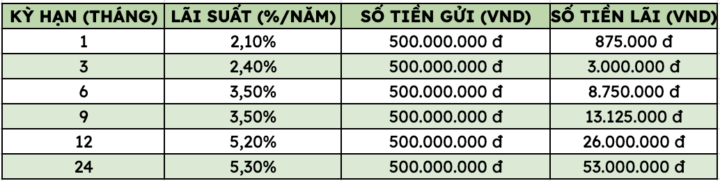 Thus, depositing 500 million VND at VietinBank, customers can receive the highest interest rate as follows (applied to individual customers depositing directly at the counter):