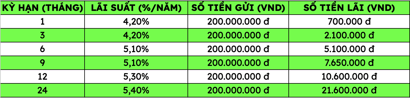 Thus, depositing 200 million VND at VPBank, customers can receive the highest interest rate as follows (applicable to individual customers depositing directly at the counter):
