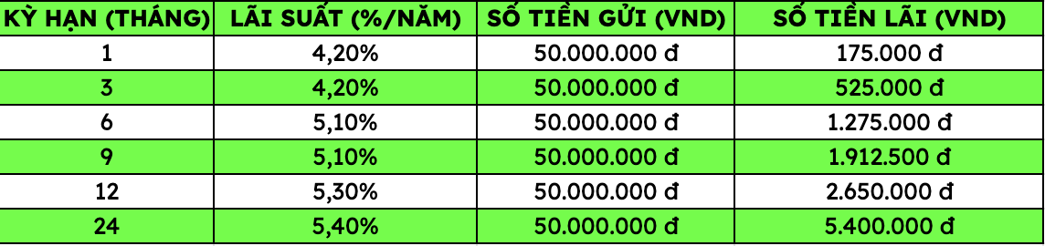 Thus, depositing 50 million VND at VPBank, customers can receive the highest interest rate as follows (applicable to individual customers depositing directly at the counter):